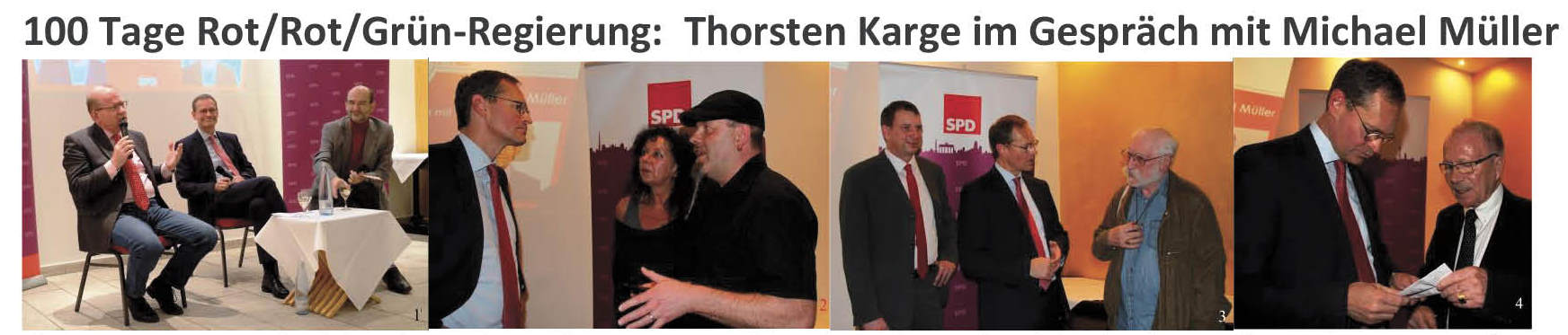 Thorsten Karge, Mitglied des Abgeordnetenhauses von Berlin und Bundestagskandidat für die SPD, hatte den Regierenden Bürgermeister in das Restaurant Maestral gegenüber vom Rathaus Reinickendorf eingeladen. (Foto 1) Unter der kompetenten Moderation des Journalisten Christian Walther beantwortete Michael Müller gut aufgelegt und freimütig die Fragen, die den Reinickendorfern auf den Nägeln brennen: von Verlängerung der U8 in das Märkische Viertel über Nachnutzung des Flughafens Tegel bis zur Integration von Flüchtlingen. (Foto 6) Nach der offiziellen Publikums-Fragerunde aus dem Auditorium im überfüllten Saal nutzten viele Besucher die Möglichkeit zum direkten Gespräch mit dem Regierenden. Zwei Vertreter der Bürgerinitiative „für den Erhalt der Trettachzeile 15 / Altes Wasserwerk Tegel“ äußerten ihre Befürchtung, dass die Bewohner durch Luxus-Sanierung bei Eigentümerwechsel – ähnlich wie bei der Siedlung Steinbergpark – vertrieben werden. (Foto 2) Dem langjährigen SPD-Mitglied Horst Uecker liegen die Reinickendorfer Probleme besonders am Herzen, und Aleksander Dzembritzki unterstützte die Anregungen . (Foto 3) Werner Plato vom Landesverband schulischer Fördervereine Berlin Brandenburg e.V. informiert über die wertvolle Arbeit der Musikschulen. (Foto 4) Von den 6 Politikern, die um die besten Plätze auf der SPD-Liste für die Bundestagswahl konkurrieren, nutzten Aleksander Dzembritzki (Foto 5) und Alexander Kulpok (Foto 7) die sehr informative Veranstaltung, um sich ebenfalls mit dem Regierenden Bürgermeister auszutauschen.