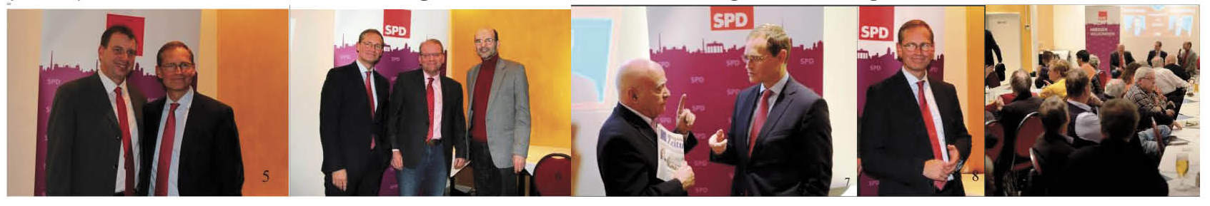 Thorsten Karge, Mitglied des Abgeordnetenhauses von Berlin und Bundestagskandidat für die SPD, hatte den Regierenden Bürgermeister in das Restaurant Maestral gegenüber vom Rathaus Reinickendorf eingeladen. (Foto 1) Unter der kompetenten Moderation des Journalisten Christian Walther beantwortete Michael Müller gut aufgelegt und freimütig die Fragen, die den Reinickendorfern auf den Nägeln brennen: von Verlängerung der U8 in das Märkische Viertel über Nachnutzung des Flughafens Tegel bis zur Integration von Flüchtlingen. (Foto 6) Nach der offiziellen Publikums-Fragerunde aus dem Auditorium im überfüllten Saal nutzten viele Besucher die Möglichkeit zum direkten Gespräch mit dem Regierenden. Zwei Vertreter der Bürgerinitiative „für den Erhalt der Trettachzeile 15 / Altes Wasserwerk Tegel“ äußerten ihre Befürchtung, dass die Bewohner durch Luxus-Sanierung bei Eigentümerwechsel – ähnlich wie bei der Siedlung Steinbergpark – vertrieben werden. (Foto 2) Dem langjährigen SPD-Mitglied Horst Uecker liegen die Reinickendorfer Probleme besonders am Herzen, und Aleksander Dzembritzki unterstützte die Anregungen . (Foto 3) Werner Plato vom Landesverband schulischer Fördervereine Berlin Brandenburg e.V. informiert über die wertvolle Arbeit der Musikschulen. (Foto 4) Von den 6 Politikern, die um die besten Plätze auf der SPD-Liste für die Bundestagswahl konkurrieren, nutzten Aleksander Dzembritzki (Foto 5) und Alexander Kulpok (Foto 7) die sehr informative Veranstaltung, um sich ebenfalls mit dem Regierenden Bürgermeister auszutauschen.