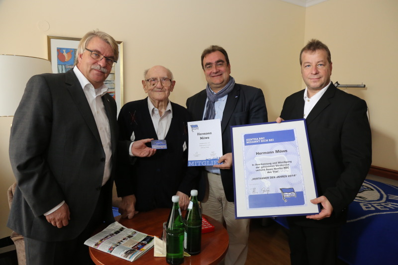 Nur wenige Wochen nach seinem 102. Geburtstag übergaben Christian Wolter (l.) und Ingmar Pering (2.v.r.) vom Hertha BSC-Präsidium den Hertha-Fan gemeinsam mit Bezirksbürgermeister Frank Balzer (CDU) (r.) am 7. November ein ganz besonderen Geschenk. Möws erhielt einerseits die Mitgliedschaft und erhielt nun als ältestes Mitglied die Mitgliedsnummer 1912 gemäß seines Geburtsjahres.