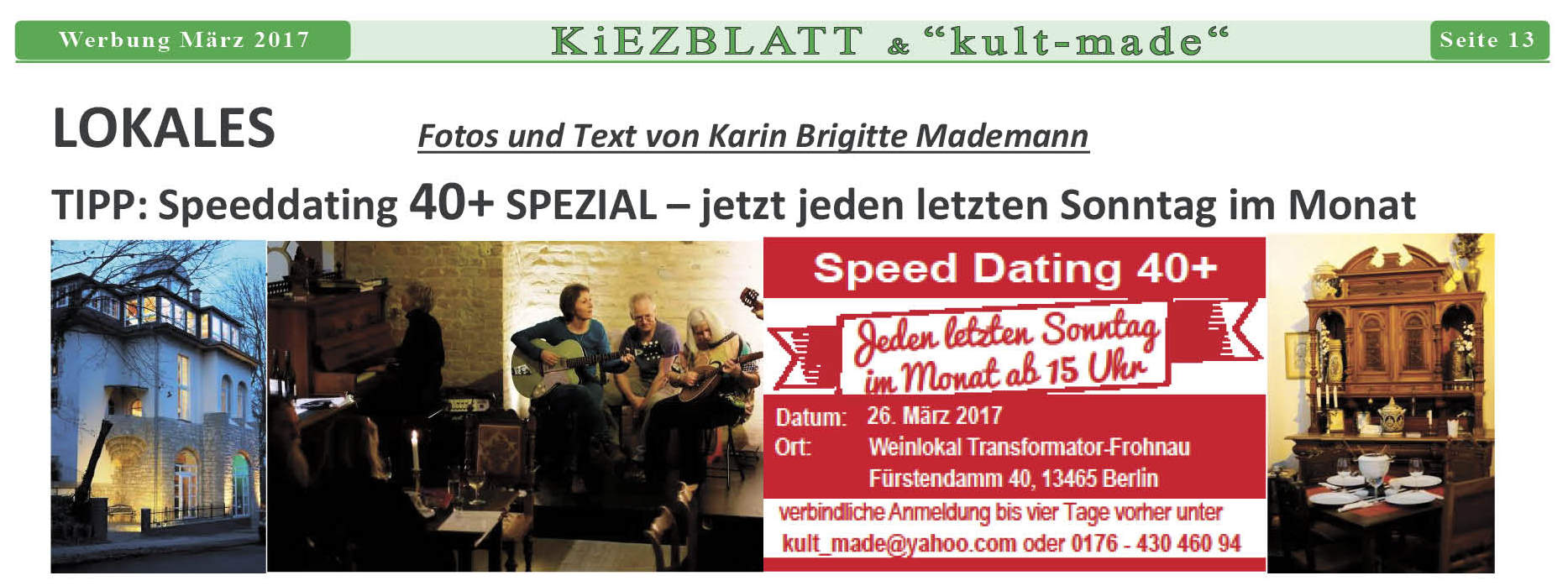 Das Kennenlernen-Treffen für Freizeit, Kultur, Kulinarisches, Sport, Reisen und Partner ist inzwischen schon für jeden letzten Sonntag im Monat ein fester Termin im Reinickendorfer Kalender. Anfänglich wurde dieses Treffen für Singles ab 40 + von einigen mit Skepsis betrachtet, weil es sich um eine völlig neue Art Veranstaltung handelt. Inzwischen hat es sich jedoch herumgesprochen, dass diese Form des persönlichen seriösen Kennenlernens in netter Atmosphäre so angenehm wie eine Einladung zur privaten Feier unter Freunden ist. An speziellen Thementischen finden sich schnell Gleichgesinnte zusammen, es gibt spontane Musikeinlagen und manchmal wird getanzt. Jeder Gast erhält Tombola-Lose, die nur Gewinne enthalten. In diesem Wohlfühl-Ambiente und individueller Bewirtung finden im Nebenraum die Speeddating-Runden 40+/50+/60+/70+ statt, die Gelegenheit zum besseren Kennenlernen bieten. Zur individuellen Organisation gehört auch ein Shuttle-Service (meist mit einer Stretch-Limousine) für Nutzer öffentlicher Verkehrsmittel vom S-Bahnhof Frohnau zum Wein-Musik-Café Transformator. Das Lokal ist für diese geschlossene Gesellschaft gemietet, sodass die Veranstaltung völlig ungestört von anderen Gästen ist. Der Beitrag von 40/30€ (Rabatte für begeisterte Wiederholer, Gruppen und Geschenk-Gutscheine) beinhaltet Bewirtung, Shuttle-Service, Tombola, Programm und Überraschungen. Infos und verbindliche Anmeldungen für die nächsten Veranstaltungen am 26.3.2017 (usw.) /15-20 Uhr bei kult_made(@)yahoo.com / 0176 430 460 94