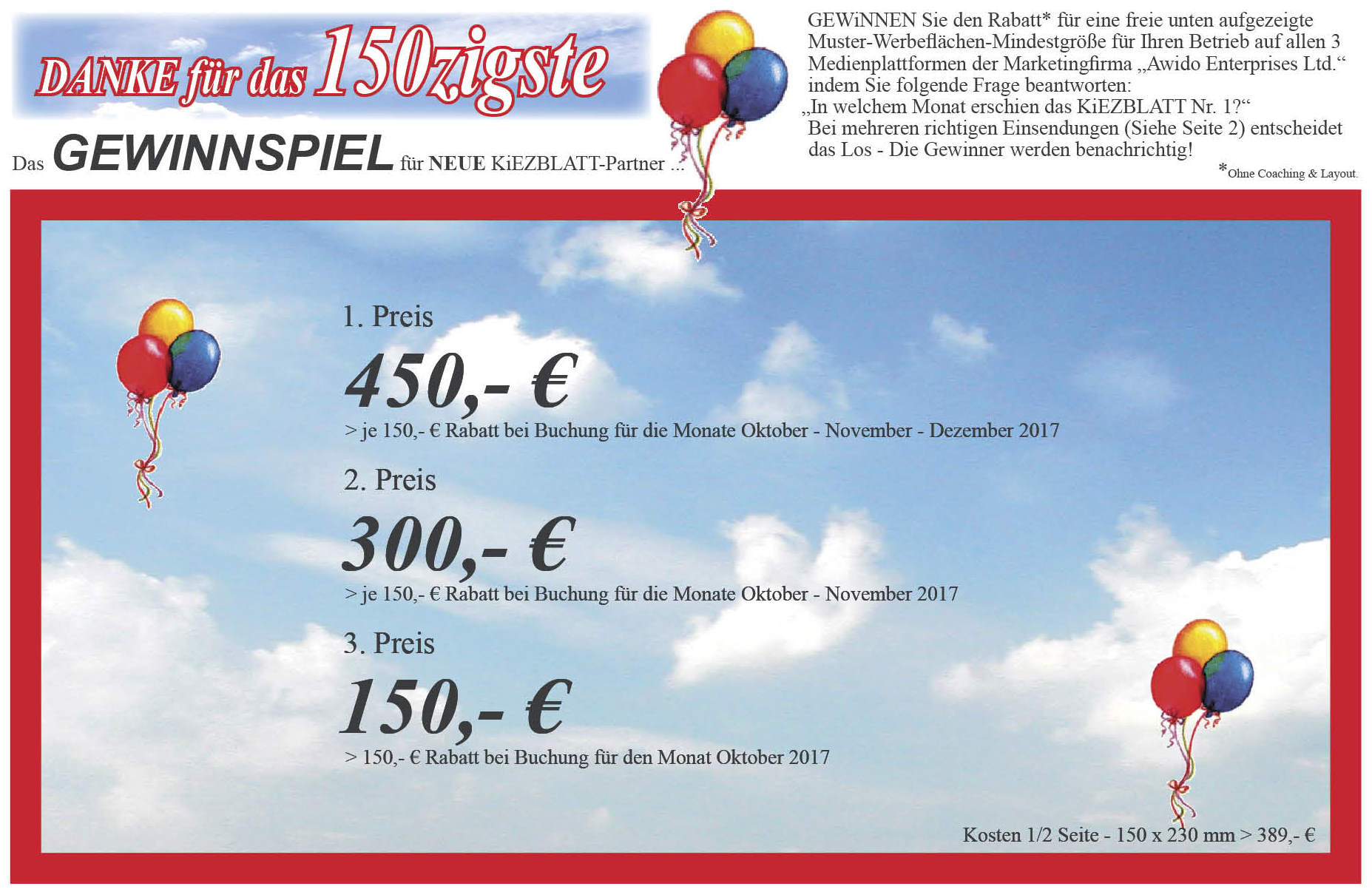 150 x KiEZBLATT > GEWiNNEN Sie den Rabatt* für eine freie Muster-Werbeflächen-Mindestgröße für Ihren Betrieb auf allen 3 Medienplattformen der Marketingfirma „Awido Enterprises Ltd.“ indem Sie folgende Frage beantworten: