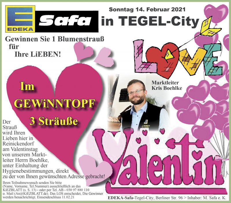 Begeisterten „vorzuspielen – nein er kann sich jetzt mit seinem Gutschein wirklich den Wunsch erfüllen, der ihm tatsächlich Freude bereitet.Welche Idee Corona unter den Tegeler Geschäftsleuten hervorbrachte, das lesen Sie bitte ganz rechts. Dort finden Sie Tegeler, die sich von diesem sehr, sehr kleinen Ding nicht so schnell unterkriegen lassen – bitte machen Sie mit. DANKEVorhin sprach ich vom Valentinstag. Liebe KiEZBLATT Leserin und -Leser – Dazu hat sich unser Marktleiter Herr Böhlke was Besonderes einfallen lassen!