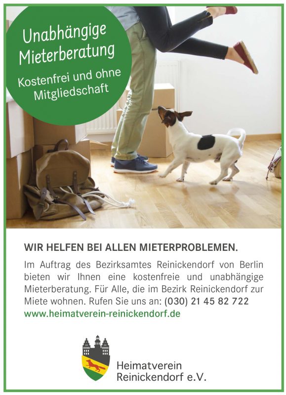 Bei Fragen zur Betriebskostenabrechnung, Wohnungskündigung, Mieterhöhung oder wenn es Ärger mit dem Nachbarn gibt, steht Ihnen die Mieterberatung des Heimatvereins Reinickendorf e.V. im Auftrag des Bezirksamtes Reinickendorf kostenfrei zur Verfügung.