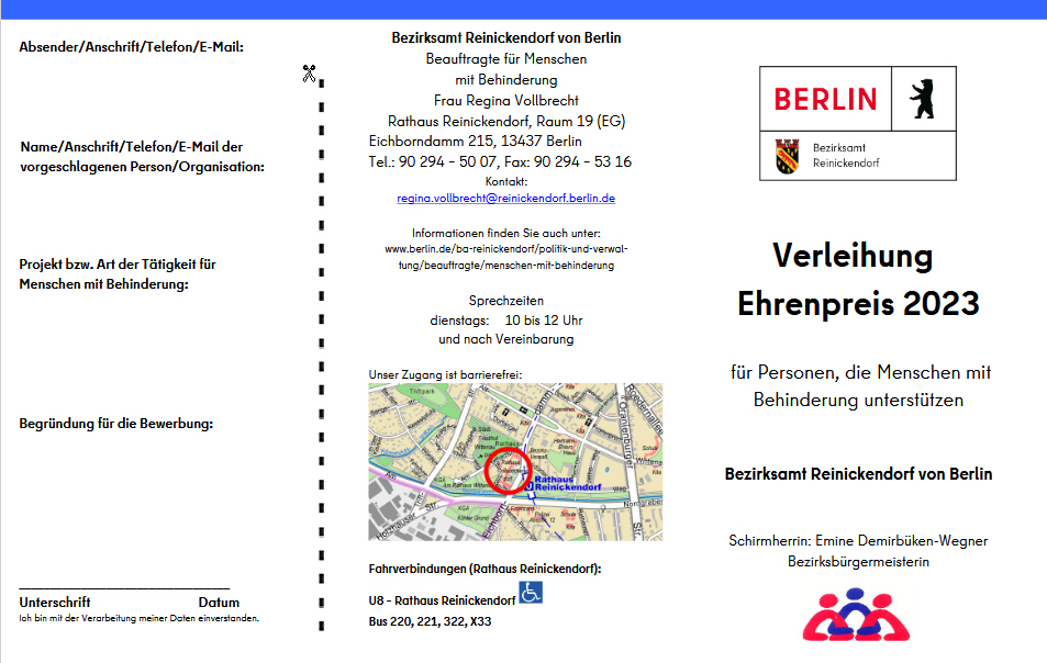Beauftragte für Menschen mit Behinderungen von Berlin-Reinickendorf Eichborndamm 215 – 13437 Berlin – Tel: 030 90294-5007