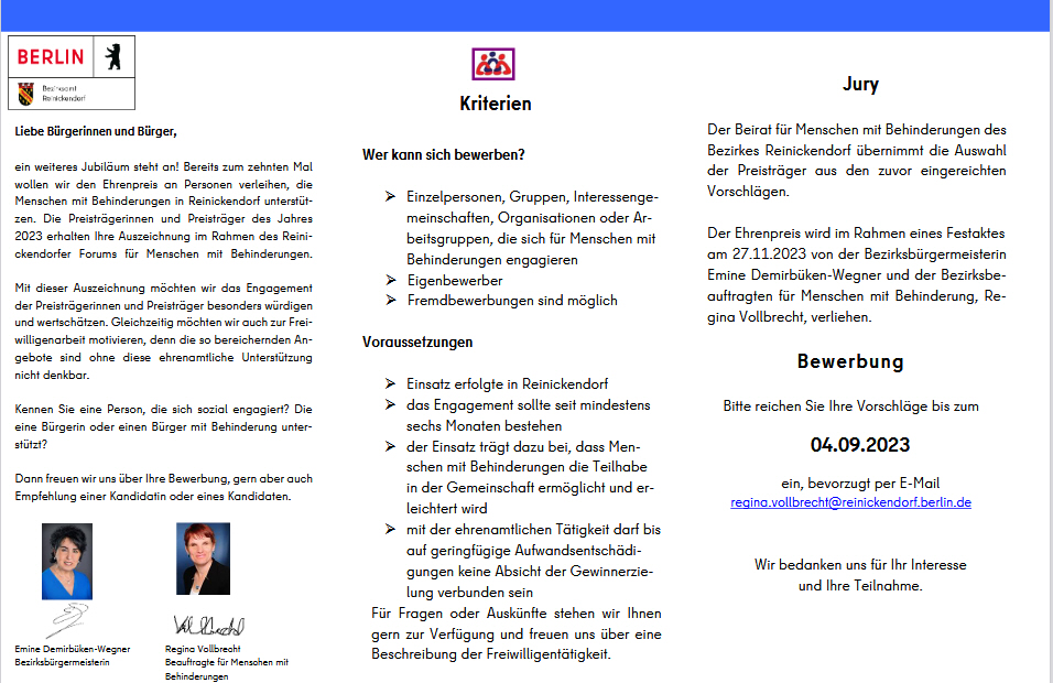 Die Jury wird auch in diesem Jahr wieder aus Mitgliedern des Reinickendorfer Beirates für Menschen mit Behinderungen bestehen. Sie übernimmt die Auswahl der Ehrenpreisträgerinnen und Ehrenpreisträger.