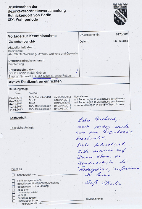 Ausgangspunkt war eine Antragsinitiative der Bezirksverordneten Claudia Skrobek (CDU) in der Bezirksverordnetenversammlung vom 12.12.2012, das Bezirksamt möge sich gegenüber dem Senat für die Aufnahme der Residenzstraße in das Förderprogramm einzusetzen (Kopie anbei).