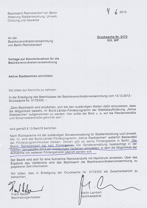 Sodann hatte der Abgeordnete für Reinickendorf Burkard Dregger (CDU) in einer Schriftlichen Anfrage an den Senat am 18.10.2013 danach gefragt, wie der Senat den Handlungsbedarf in der Residenzstraße beurteilt und ob er die Residenzstraße als förderwürdig ansieht. In seiner Antwort vom 25.11.2013 bescheinigte der damalige Staatssekretär Gothe (SPD) der Residenzstraße lediglich einen „mittleren Handlungsbedarf“. Erkenntnisse zu negativen Entwicklungstrends lägen nicht vor (Kopie anbei).