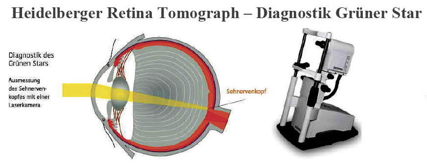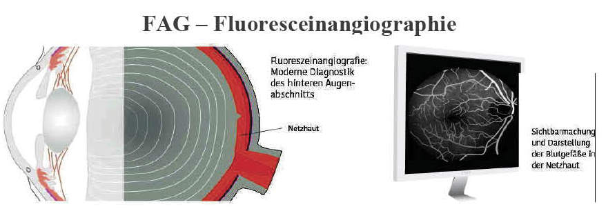 Die Fluoreszeinangiografie wird bei der Diagnostik altersbedingter Makuladegeneration (AMD), bei diabetischen Netzhautveränderungen oder Durchblutungsstörungen z.B. aufgrund einer Thrombose oder Tumoren, eingesetzt. Die Verteilung der leuchtenden Substanz in den Netzhautgefäßen am Augenhintergrund lässt Gefässveränderungen – z. B. diabetische Retinopathie – bereits in einem sehr frühen Stadium erkennen.Mit einer Laser-Kamera werden dreidimensionale Bilder vom Sehnervenkopf (Papille) erstellt. Die ca. 147.000 Messpunkte werden am Computer ausge-wertet und die Ergebnisse der Messung gespeichert, um mit späteren Messun-gen verglichen zu werden. Schon geringste Schäden am Sehnerv durch den