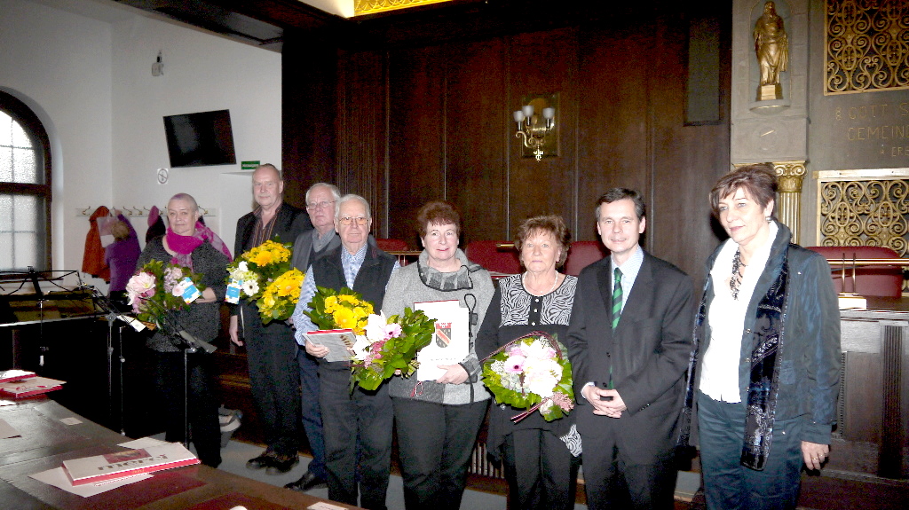 (Die Geehrten v.l- Gudrun Emel, Helmut Beyer, Martin Lother, Manfred Grabowsky, Monika Gerst, Ingrid Klinger, Bezirksstadtrat Uwe Brockhausen, Bezirksbehindertenbeauftragte Claudia Meier)