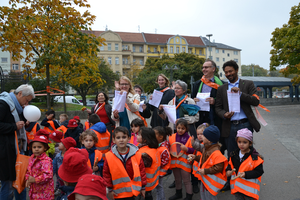 stattfindenden Kita Aktionstag mit den Kindern und Mitarbeitern des Familienzentrums und zogen gemeinsam mit ihnen zum Franz-Neumann-Platz.
