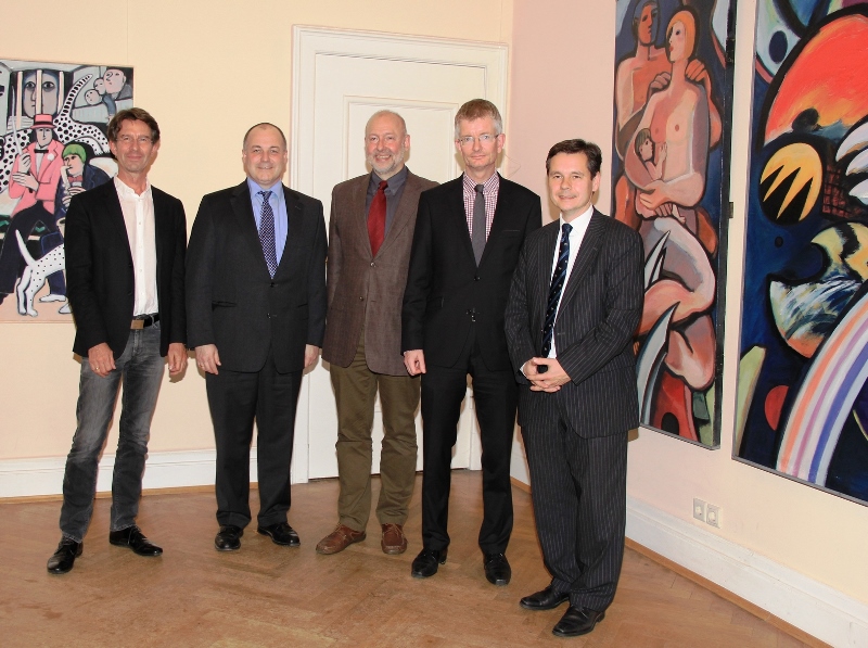 Bid-2: v.rechts (Uwe Brockhausen, Kai-Peter Breiholdt, Herr Henkel, Jürn Jakob Schultze-Berndt, Axel Ochschim) vor den Gemälden von Dietrich Kaufmann /Ausstellung des Kunstvereins Centre Bagatelle Bid-3: v.rechts: Uwe Brockhausen & Cornelja Hasler