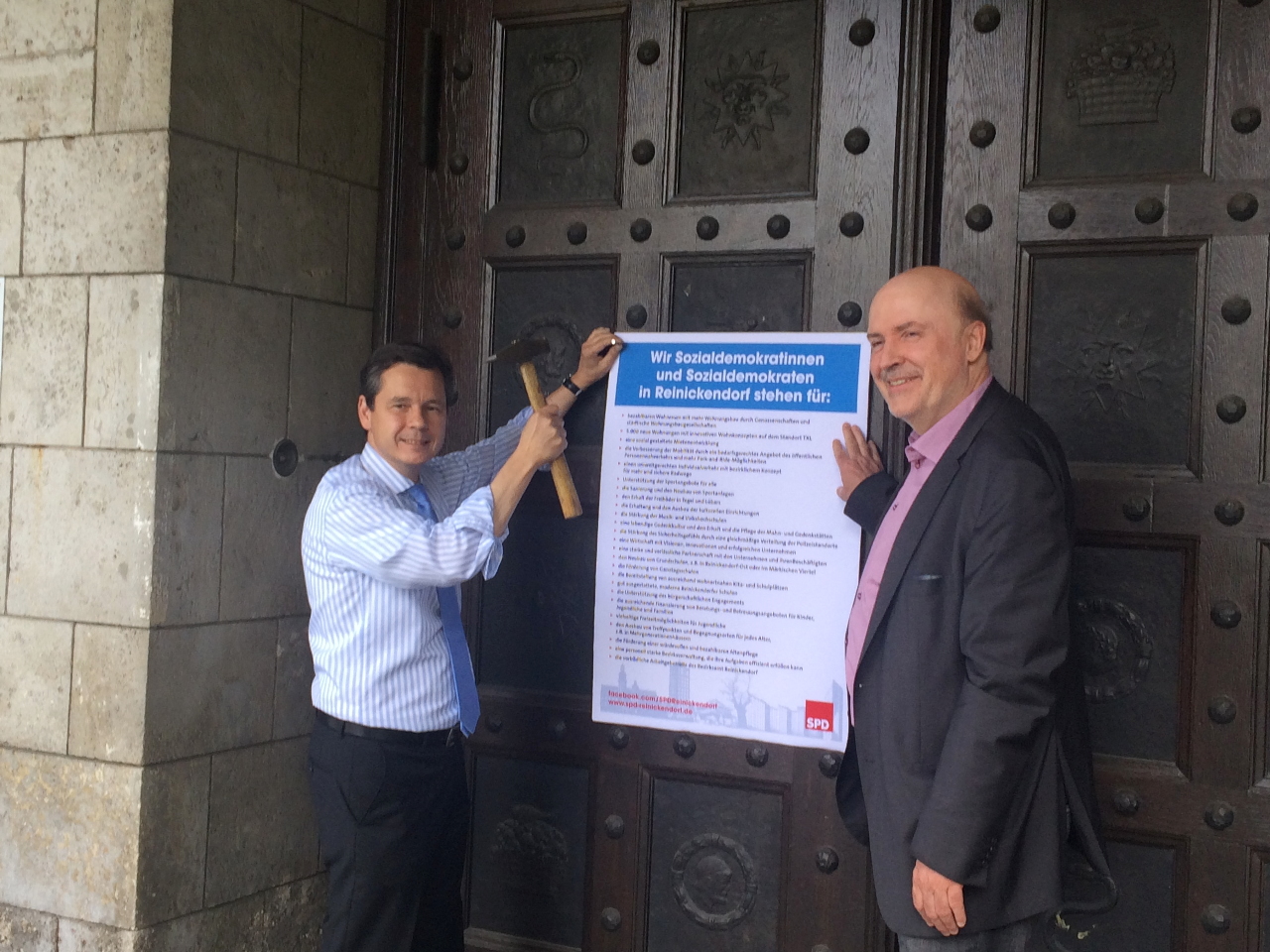 Wie Martin Luther vor 499 Jahren seine 95 Thesen in Wittenberg, so heftete der SPD-Bürgermeisterkandidat Uwe Brockhausen am 5. September die 25 Wahlkampfthesen der Reinickendorfer SPD an die Pforte des Rathauses – assistiert vom Kreisvorsitzenden Jörg Stroedter (Foto). Ein geschickter Vorgriff auf das Luther-Jahr 2017 mit aktuellen Inhalten für den Berliner Wahltag am 18.September 2016.