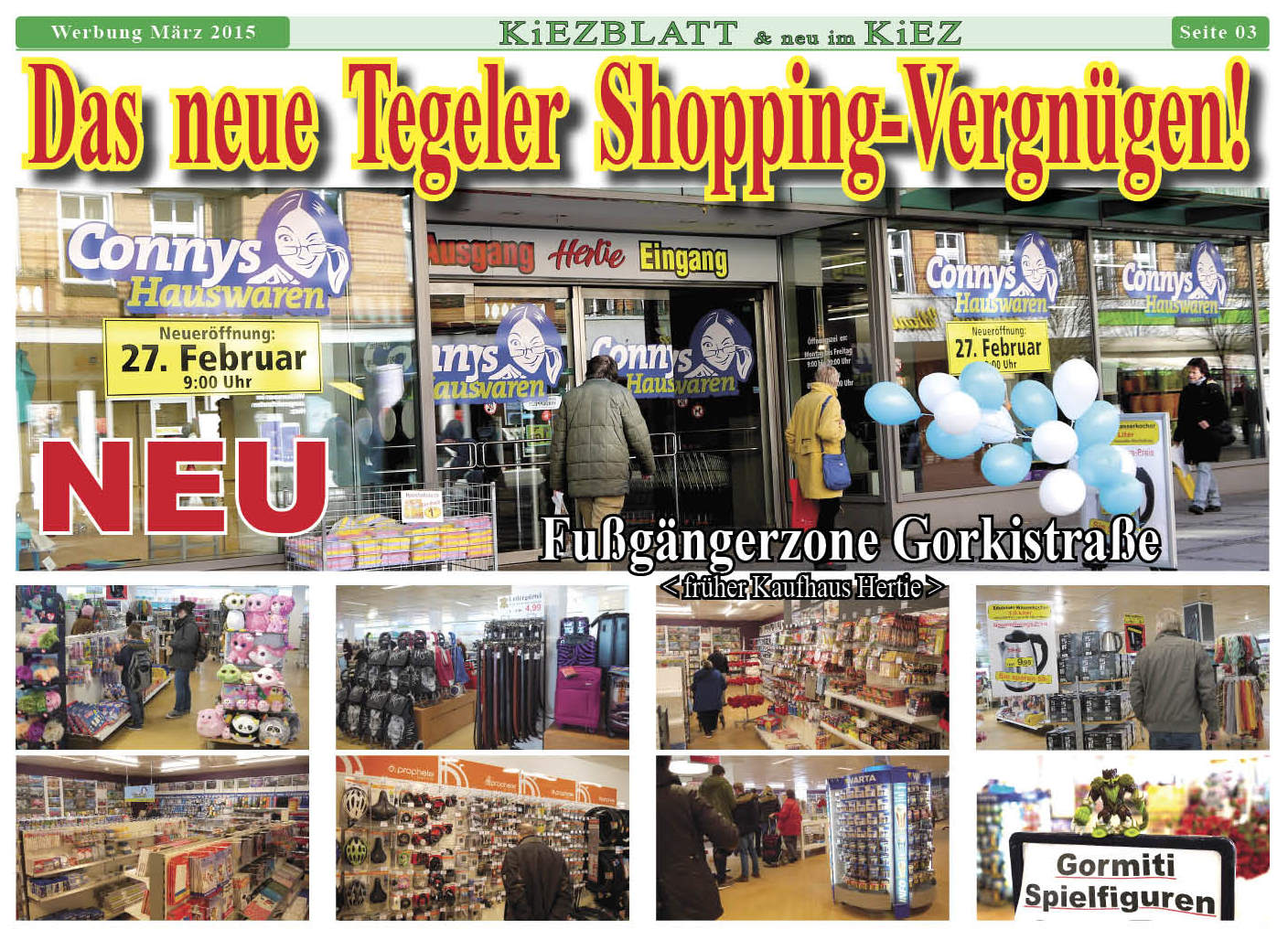 22. März 2015Alles Wirtschaft, HandelKB-Redaktion Das NEUE Tegeler Shopping-Vergnügen Connys Hauswaren in der Fußgängerzone Gorkistraße 2-8 in Berlin 13507 Ehemals Hertie – offen Mo-Fr 9-20 und Sa 9-18 Uhr