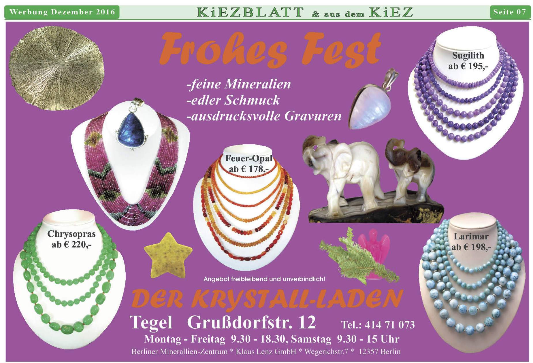 03. Dezember 20160PRKB-Redaktion Der KRYSTALL-LADEN im Dezember Frohes Fest allen Leserinnen & Lesern aus der Grußdorfstraße in Tegel!