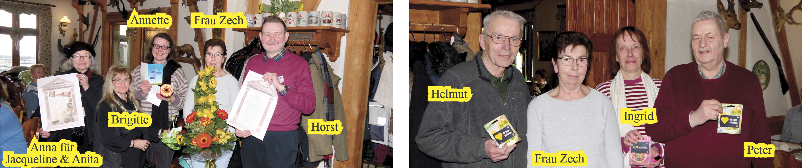 Am Schluss des Events bedankten sich die Spaziergänger bei Frau Zech mit besonderen Aufmerksamkeiten. (Siehe Bild oben) So hatten die leider verhinderten Jacqueline & Anna ein Gedichtchen umrahmt mit KiEZBLATT Ausschnitten erstellt. Spaziergänger Horst überreichte ein „Spaziergangskompendium“ und im Namen aller Anwe-senden und früheren Beteiligten hatte sich unsere Spaziergängerin Annette stark in´s „Zeug“ gelegt und eine wunderschöne Karte, auf der die Anwesenden unterschreiben konnten und dazu eine tolle „3-D Blumenkomposition“ über-reicht und auch Brigitte überraschte Frau Zech (Bild unten links – vlnr).