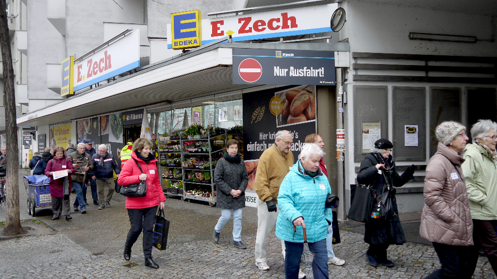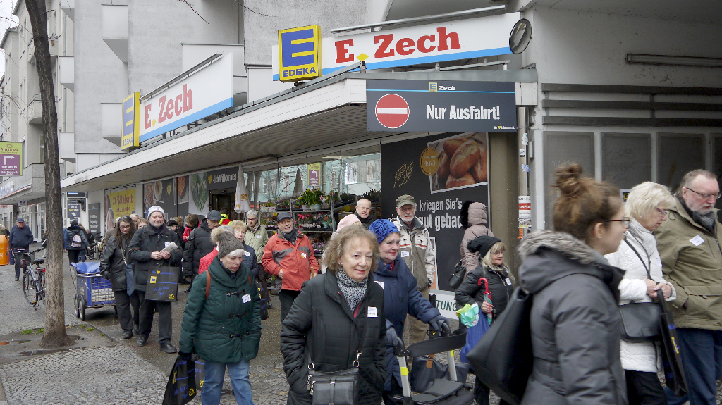 am 19.02.20, um 11 Uhr, startete Frau Zech, als Eigentümerin ihres Tegeler EDEKA Geschäftes, Berliner Str., ihren letzten „TEGEL SPAZiERGANG“. Unsere in Berlin und weit über Deutschlands Grenzen hinaus bekannte zertifizierte Stadtführerin, Frau Anna Haase (AnnaHaase.de), führte uns rund um die große Tegeler Baustelle. Im Anschluss, beim „Kaffeeplausch“ erfuhren die Teilnehmer Interessantes über die Baustelle, seinen Bauherrn sowie über die StraßenNamensgeber „Bernstorff – Budde – Gorki und Grußdorf“. Die EDEKA-Einkaufsgutscheine von Frau Zech (es gab 3 Stück) haben Hellmut, Peter und Brigitte gewonnen (Bild unten rechts).