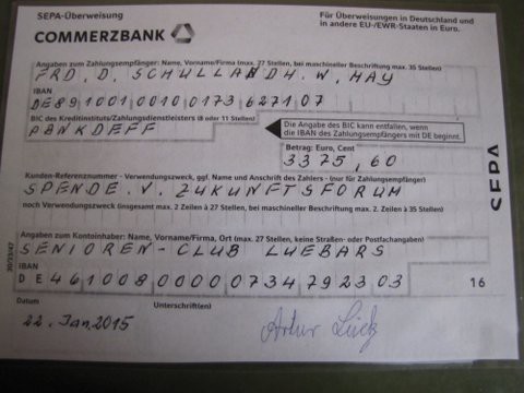 Bezirksbürgermeister Frank Balzer überreichte zusammen mit dem Initiator und Vorsitzenden des Zukunftsforums, Hans-Jürgen Schmidt und Dieter Bechmann vom Seniorenclub Lübars, im Beisein von zwei ehrenamtlichen Mitarbeitern der Seniorenvertretung, Helga Hötzl und Bernd Butkereit, einen Scheck von 3375,60 Euro, Erlös der Sternwanderung vom 4.Juli 2014.