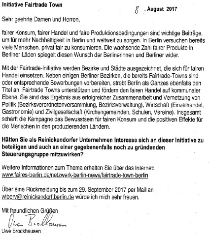 in der Anlage übersende ich ein Anschreiben des Reinickendorfer Wirtschaftsstadtrates, Herrn Uwe Brockhausen, zur Initiative Fairtrade Town.