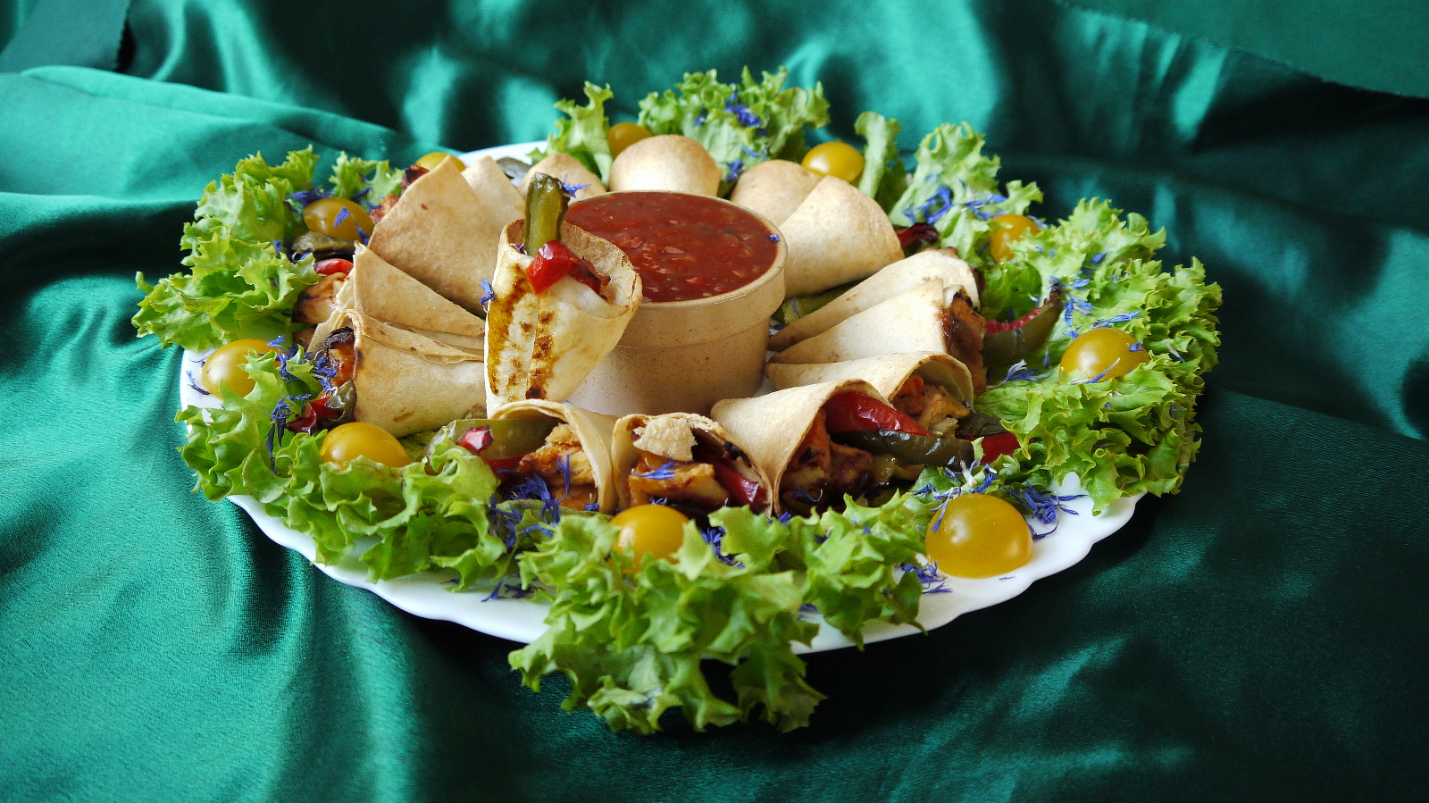 Chicken-WRAPS mit pikanter Gourmet-Füllung und feuriger SALSA, Kirschtomaten in Lollo Biondo bei Kornblumen