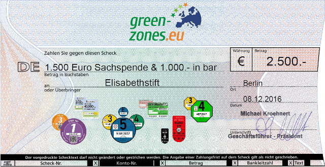 Um dieses Thema spielerisch zu vermitteln, hat die Green-Zones GmbH ein Kartenspiel mit europäischen Umweltplaketten und entsprechenden Verkehrszeichen entwickelt und stiftet über die 1.500 Euro Sachspende für das Blindenhandwerk hinaus 1.000 Euro in bar sowie 500 Kartenspiele an das Elisabethstift.