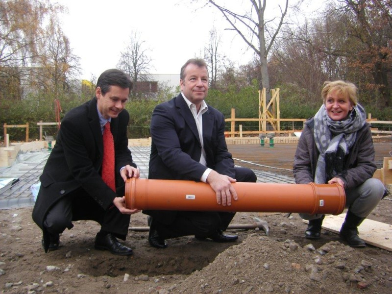 In Anwesenheit von Bezirksbürgermeister Herr Frank Balzer wurde am Senftenberger Ring 29 im Märkischen Viertel der Grundstein zum Neubau der evangelischen Regenbogen-Kita gelegt. Dem Brauch gemäß befüllte die Vorstandsvorsitzende des Evangelischen Kirchenkreisverbandes für Kindertageseinrichtungen Berlin Mitte-Nord, Frau Kathrin Janert, eine Röhre mit den aktuellen Bauplänen, Münzen und einer Tageszeitung, die sie zusammen mit Bezirksbürgermeister Herr Frank Balzer und Stadtrat Herr Uwe Brockhausen im Boden unter der Grundplatte versenkte.