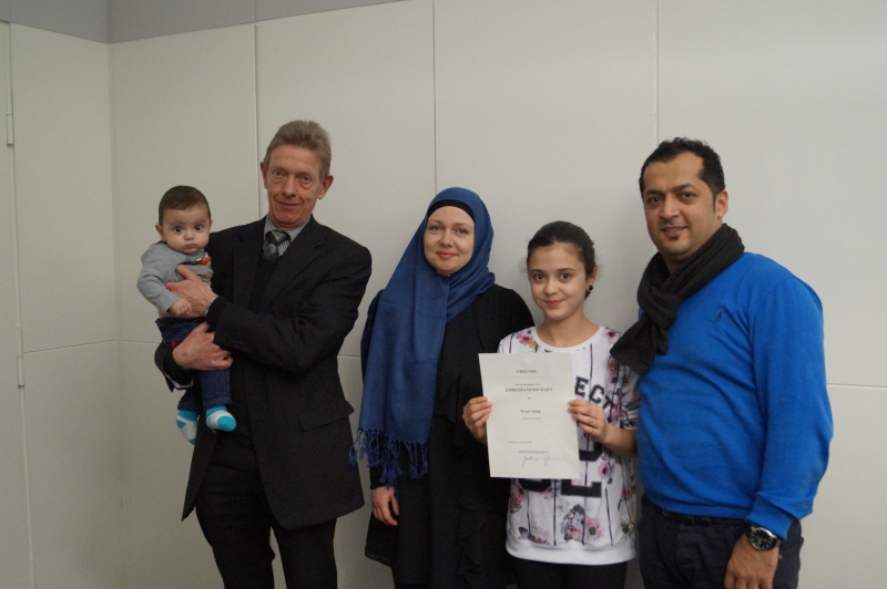 Andreas Höhne (Stellv. Bezirksbürgermeister) mit dem Patenkind Rezan Akdag, Mutter Yvonne Akdag, Schwester Rojin Akdag und Vater Yunus Akdag bei der offiziellen Übergabe.