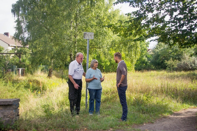 Bild: Sonja Hartmann Bildunterschrift: Der Ortsvorsitzende der CDU Wittenau Björn Wohlert (rechts) im Gespräch mit Anwohnern zur Pflege der Gräser „Bei den Wörden“ in Wittenau