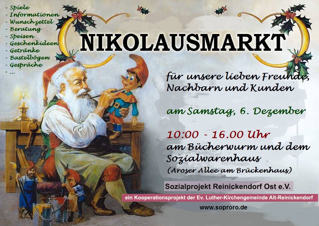„das Sozialwarenhaus und der “Bücherwurm“ des Sozialprojekt Reinickendorf Ost e.V. veranstalten am Nikolaustag, Samstag, dem 6. Dezember, zwischen 10:00 und 16:00 Uhr einen kleinen Nikolausmarkt in und vor ihren Niederlassungen am Brückenhaus Aroser Allee 151. Unseren Nachbarn, Freunden und Kunden und ihren Kindern bieten wir Informationen, Beratung, Spielspaß und natürlich preiswerte Geschenkideen.