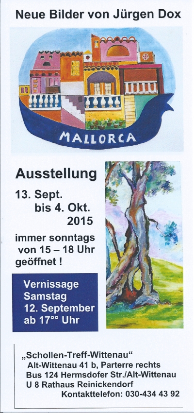 Die Sommerpause unserer Galerie im „Schollen-Treff-Wittenau“ nähert sich dem Ende und ich möchte Ihnen die Daten für die Ankündigung der neuen Ausstellung rechtzeitig zum Redaktionsschluss übersenden. Mit freundlichem Gruß – Ulrich Rohmann – Tel. 030-4344392