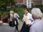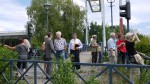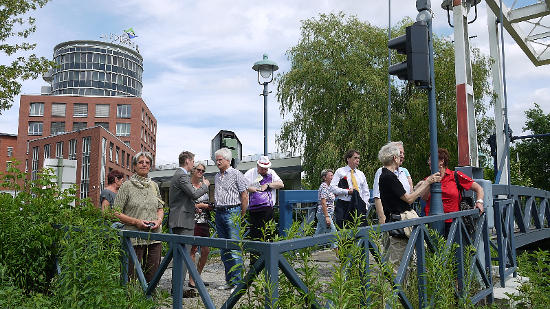 An der Brücke „Mühlensteg“ aus dem Jahre 1190 gab Herr Lambert (gelbe Krawatte) ausführliche Auskünfte über das Projekt und beantwortete Fragen der Kaufinteressenten aber auch den gekommenden kritischen Anwohnern sowie den Pressevertreten. Den Anwohnern interessierte besonders der Termin für wieder eine „freie Fahrt“ ihrer Straße, der Gabrielenstraße.