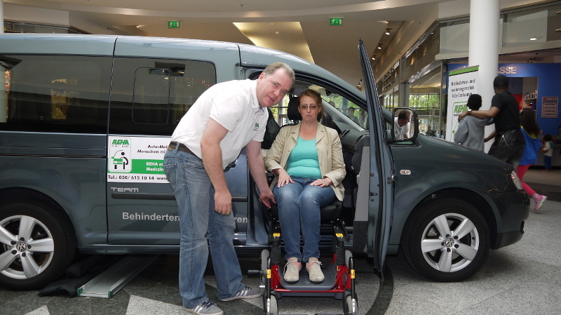 Foto: Herr Witzelsburger von der Firma „REHA mobil Berlin Medczinski GmbH“ (Mail@reha-mobil.de, ) zeigte der interessierten Bezirksverordneten Frau Borkenhagen (Mitglied im Ausschuss für Bürgerdienste, Ordnung und Verwaltung, im Jugendhilfeausschuss, im Sportausschuss, im Verkehrsausschuss) die Funktion einer bequemen Ein- und Austiegshilfe für gehbehinderte Personen.