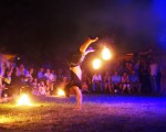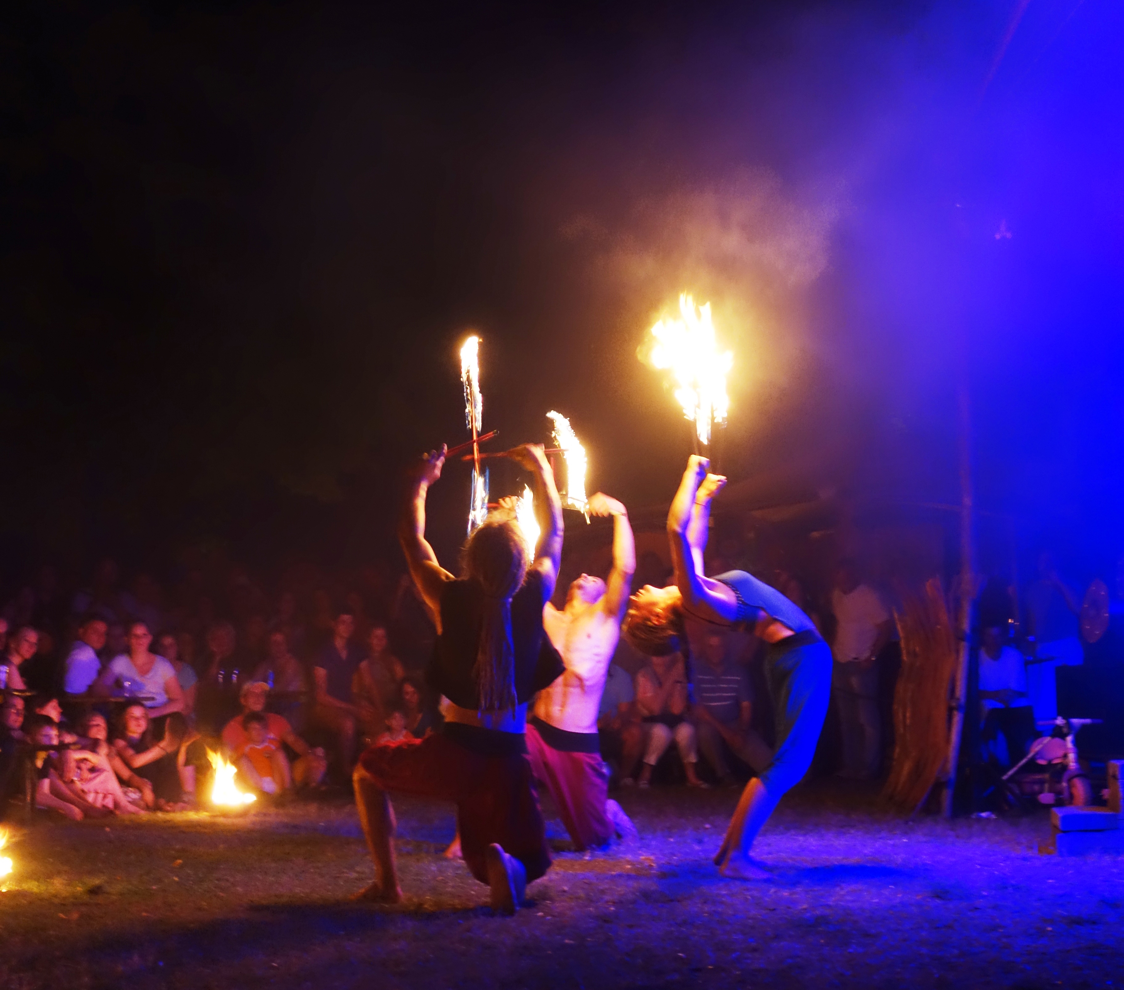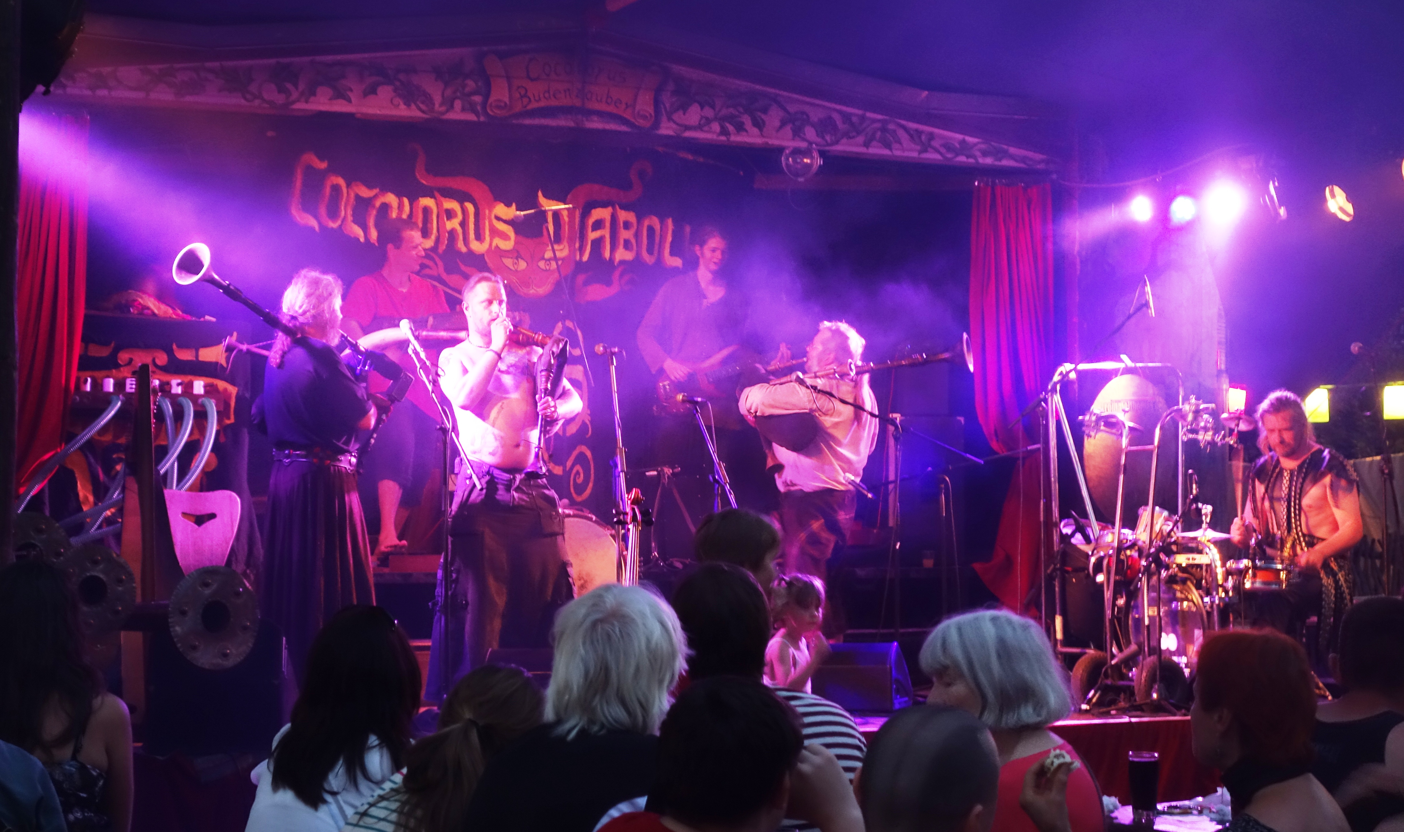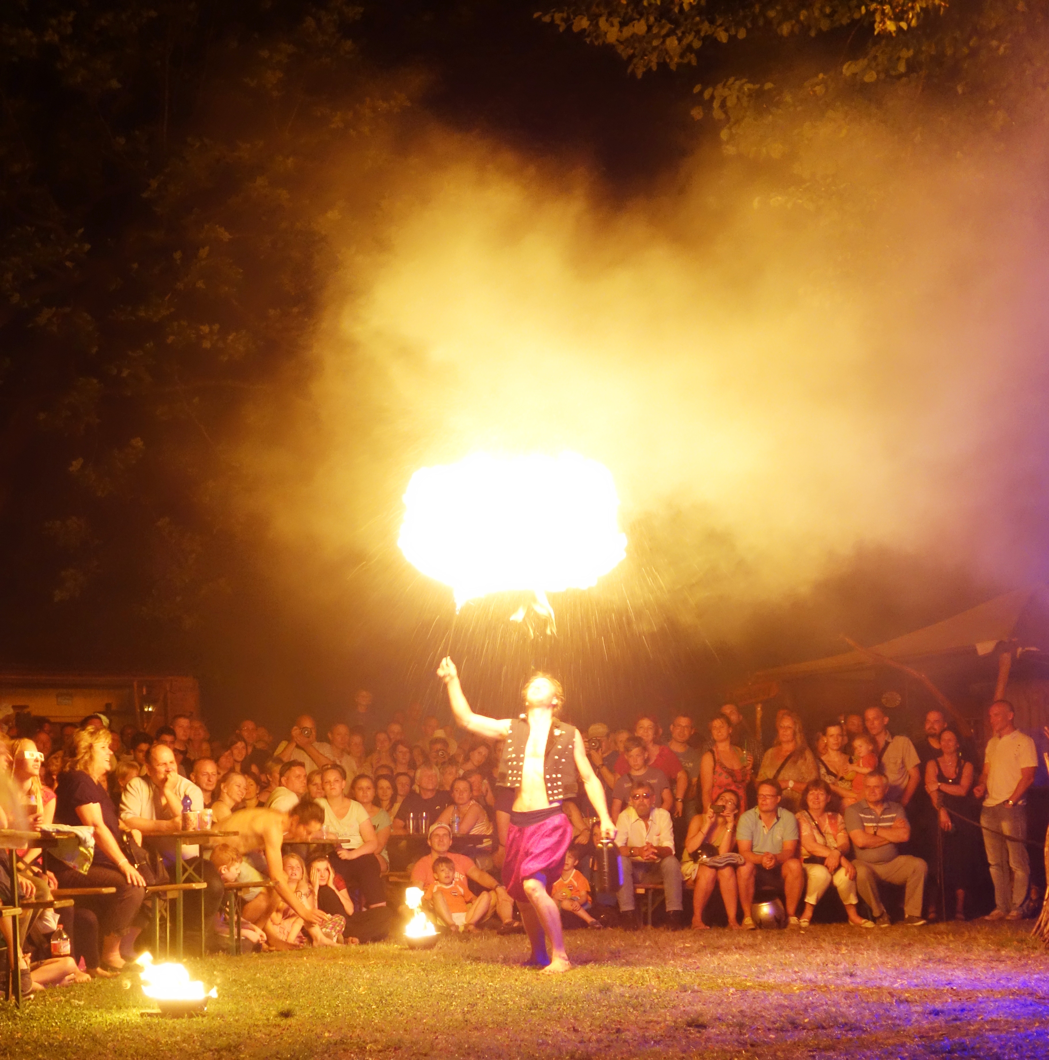 Die Bühne im Park bot mittelalterliches: Von den Darbietungen der Band „Cocolorus Diabolo“ und der Feuershow „Cococalypse“ konnten die völlig faszinierten Zuschauern nicht genug bekommen. 2 Frauen und 3 Männer boten in einer einstündigen Show eine Performance, die an Feuerwerk, Tempo, Können und Leichtigkeit kaum zu überbieten ist.