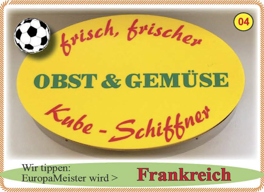 In diesem Juli-KiEZBLATT fragen wir – welche Firma hat die richtige Vorhersage nach der Siegermannschaft, dem EUROPA-MEiSTER gemacht.Hier nun die Vorhersagen der Firmen sowie auf der Seite 4 die Gruppen und alle Spiel-Termine.