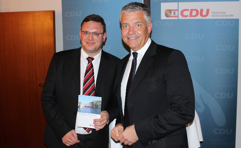 Foto (by FHM): Der Fraktionsvorsitzende Stephan Schmidt präsentiert dem Kreisvorsitzenden Frank Steffel die neue Broschüre am Stand der Fraktion auf dem Kreisparteitag der CDU Reinickendorf